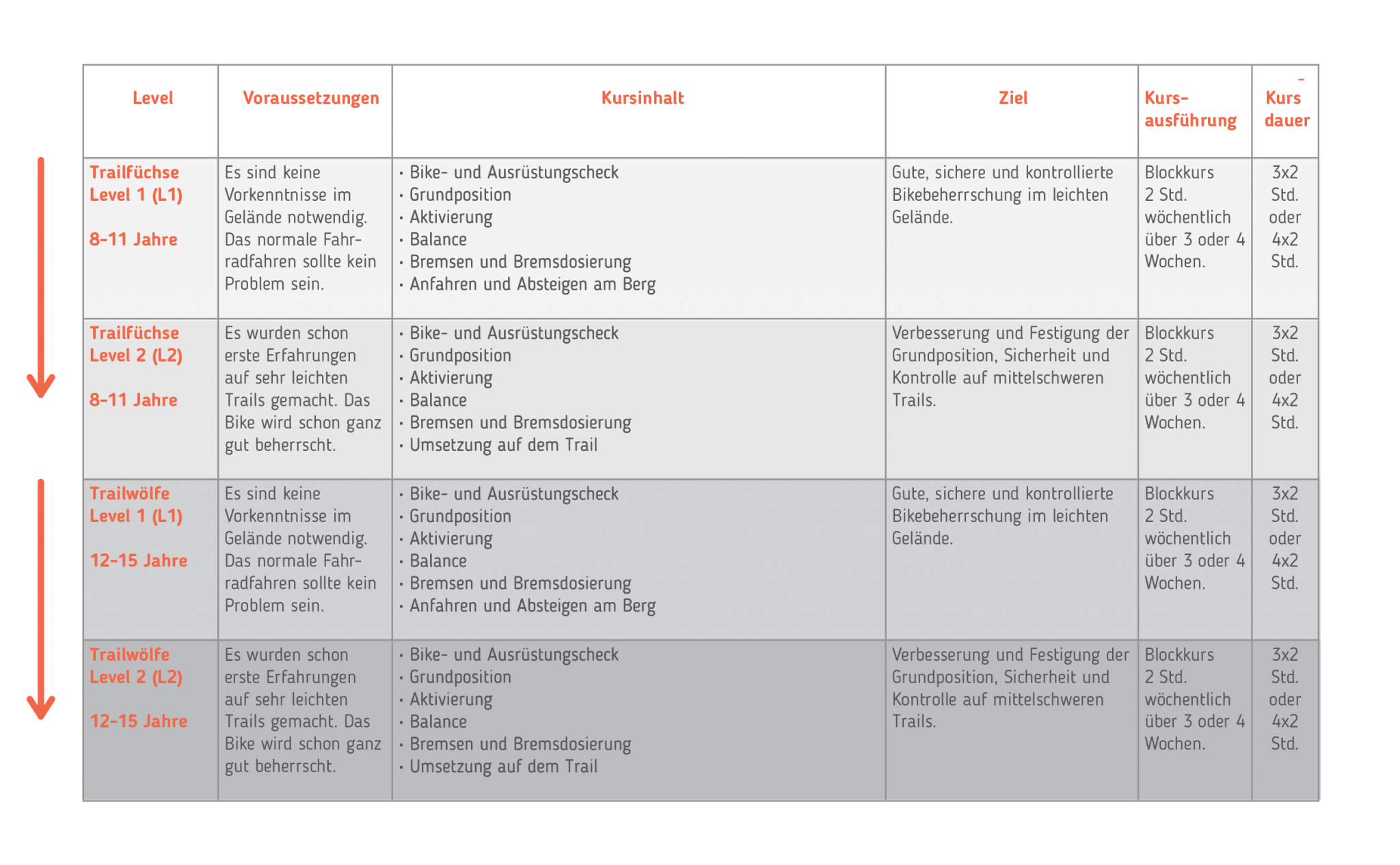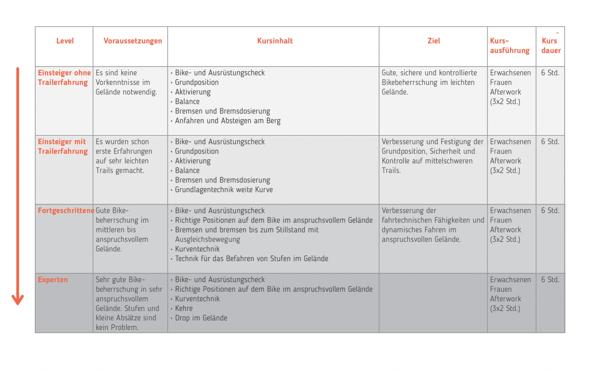 Bei den Einsteigern liegt der Fokus auf der Grundposition auf dem Bike. Mit zahlreichen Übungen wie der Balance- und den Bremsübungen festigen wir eine sauber ausgeführte Grundposition. In den fortführenden Kursen bauen wir auf den erlernten Grundlagen auf und nehmen weitere Techniken wie die richtige Bremsdosierung im Gelände und die Kurventechnik auf. Sind die Basistechniken sauber in unser Repertoire aufgenommen, geht es im Fortgeschrittenen und Experten Kurs um das dynamische Umsetzen der Techniken im Gelände, sowie das Integrieren von Geländestufen und der Kurventechnik auf dem Trail.